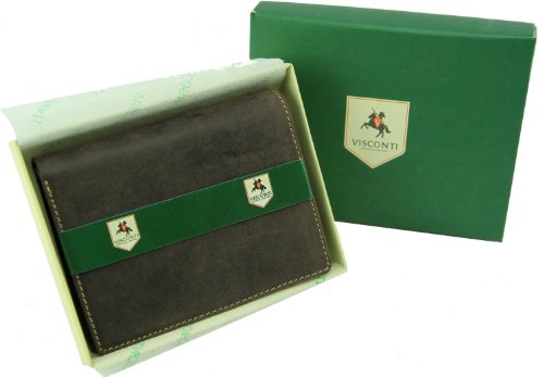 - Feature : A distressed oil brown leather wallet from the popular Visconti collection / Holds 4 credit cards 2 full ID windows + snap coin compartment / snaps down to bifold wallet size / Contrast stitching / Gift Boxed