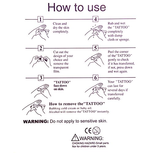 - Waterproof, so they'll still be there after swimming or showering. These tattoos typically last about three days, and can be easily removed with baby oil or rubbing alcohol. Non-allergenic and totally safe for your