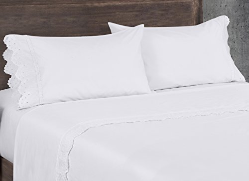 Five Queens Court Eyelet 4-Piece Sheet Set, Ribbon Trim, Embroidered, 100% Cotton, Deep Pocket, Queen, White
