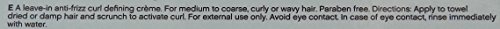A leave-in anti-frizz curl defining creme. For medium to coarse, curly or wavy hair. Anti-Frizz, paraben free, hydrating, strengthening, natural feel and motion, curl defining, antioxidant rich, smoothing, weightless, lasting results.