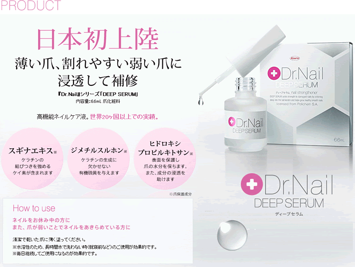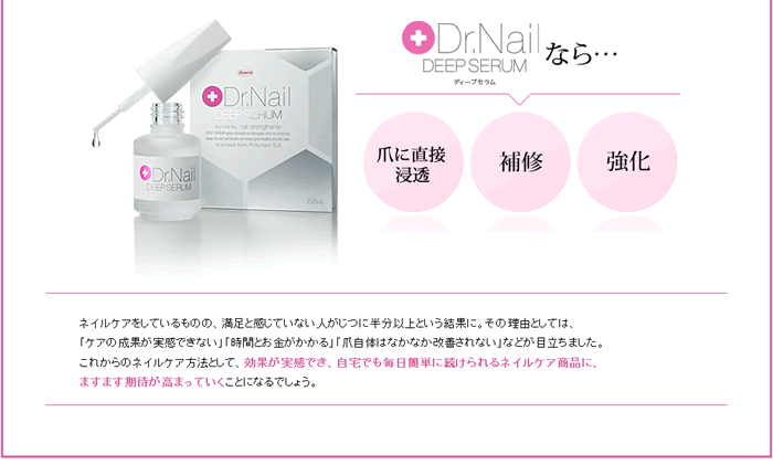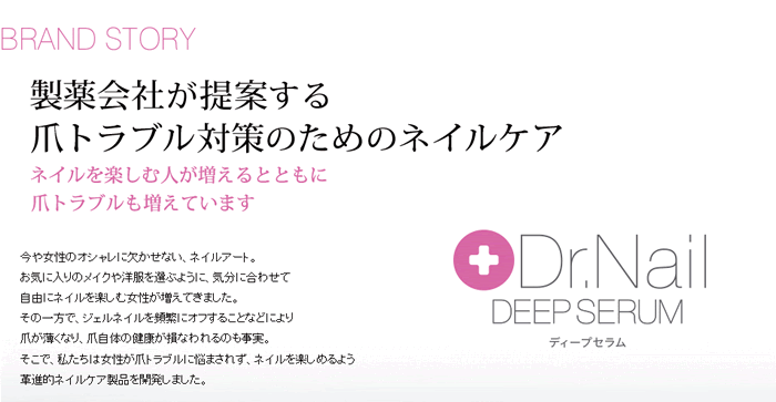 ディープセラムは、爪を健やかに保ち、ネイルファッションを楽しむための健康的な爪へと導く高機能ネイルケア美容液です。 爪が弱い、割れやすいなど、爪の悩みを抱えている全ての女性がネイルファッションを楽しめるよう開発されました。