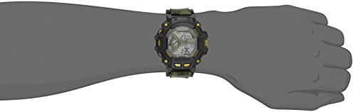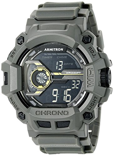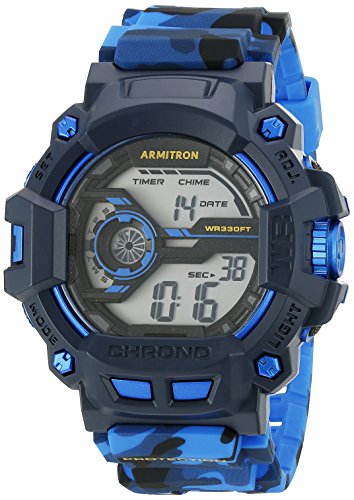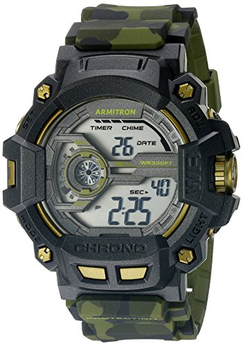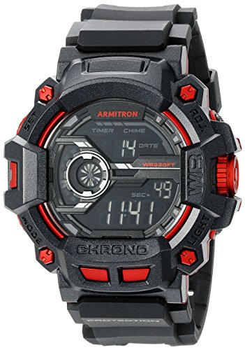 Sporty watch with engravings featuring time, seconds, day/date, chronograph, lap time, three alarms, dual time, military time, and backlight
