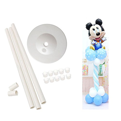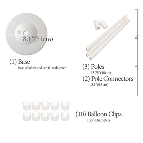 - Easy to assemble and disassemble package. Each package comes with 1 (one) water fillable base, 3 PVC white sticks ( 16 inch each ), 2 PVC stick connectors, and 10 PCS balloon round clip holder.