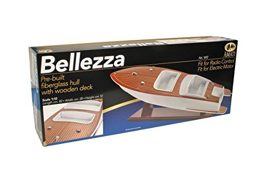 Studio : Amati Publisher : Amati Binding : Toy Product Description The Bellezza kit includes a fiberglass hull with wood, pre-assembled bridgesimil leather seats, set-chromed fittings, wooden laser-cut cockpit with steering wheel, and assembling instructions for a high quality build. This model is motorizable and suitable for remote control. Motorization kit and base not included. Length: 33.4 inches Width: 11.8 inches 0