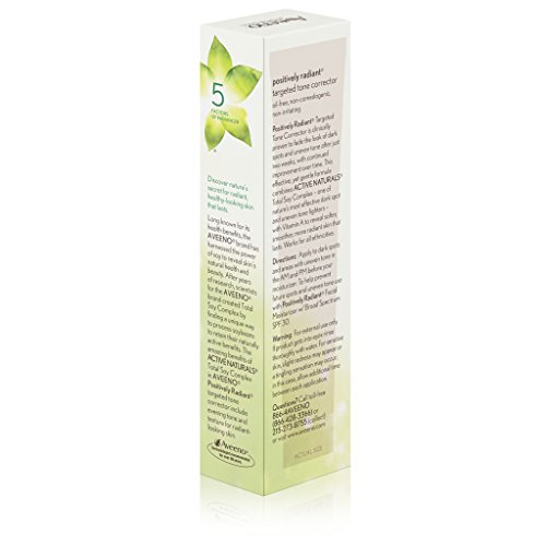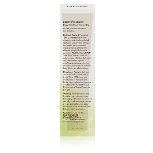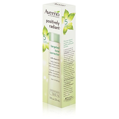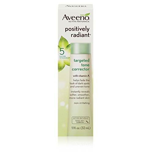 -. Binding : Health and Beauty -. Brand : Aveeno -. EAN : 0381371157464 -. Feature : 1.1-fluid ounce tube of tone corrector / Helps fade the look of stubborn brown spots in just 2 weeks / Leaves your skin looking healthier, smoother, and more radiant / Non-irritating formula help even skin tone / ACTIVE NATURALS Total Soy Complex and vitamin A helps fade the look of dark spots -. Label : Aveeno -. Manufacturer : Aveeno -. NumberOfItems : 1 -. PackageQuantity : 1 -. ProductGroup : Pantry -. ProductTypeName : BEAUTY -. Publisher : Aveeno -. Studio : Aveeno -. Title : Aveeno Positively Radiant Targeted Tone Corrector, 1.1 fl. oz. -. UPC : 381371157464