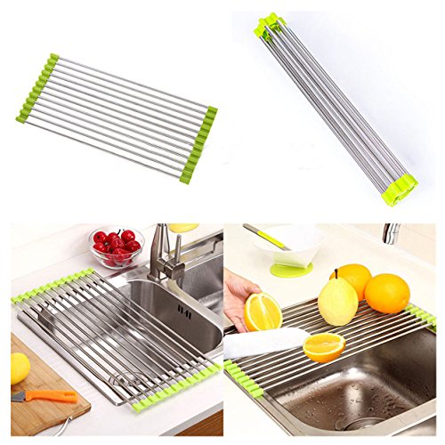 -. Feature : Multi-function sink drainer rack, unrolls above an open sink for air-drying washed dishes, for additional counter top space, or as a trivet. vegetable and fruit Drainers,great tool for the kitchen. / Made of high quality stainless steel, this drying rack is very solid and sturdy, and it can resist to constant use and rust for years. / Environmental silicon material on both ends, non-slip and used safety. / Easily wash, rinse and save plenty of storage in your kitchen by simply rolling mat up and placing it to a convenient place. / Size: Approx. 37 x 23cm