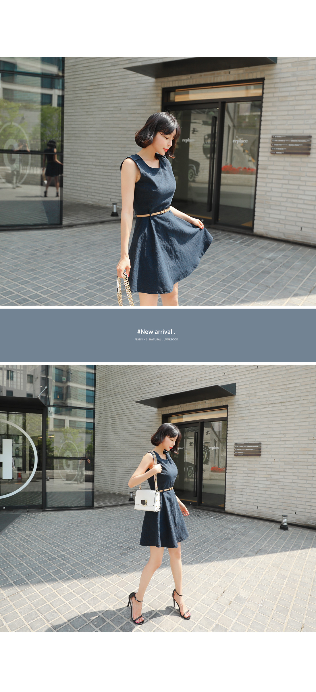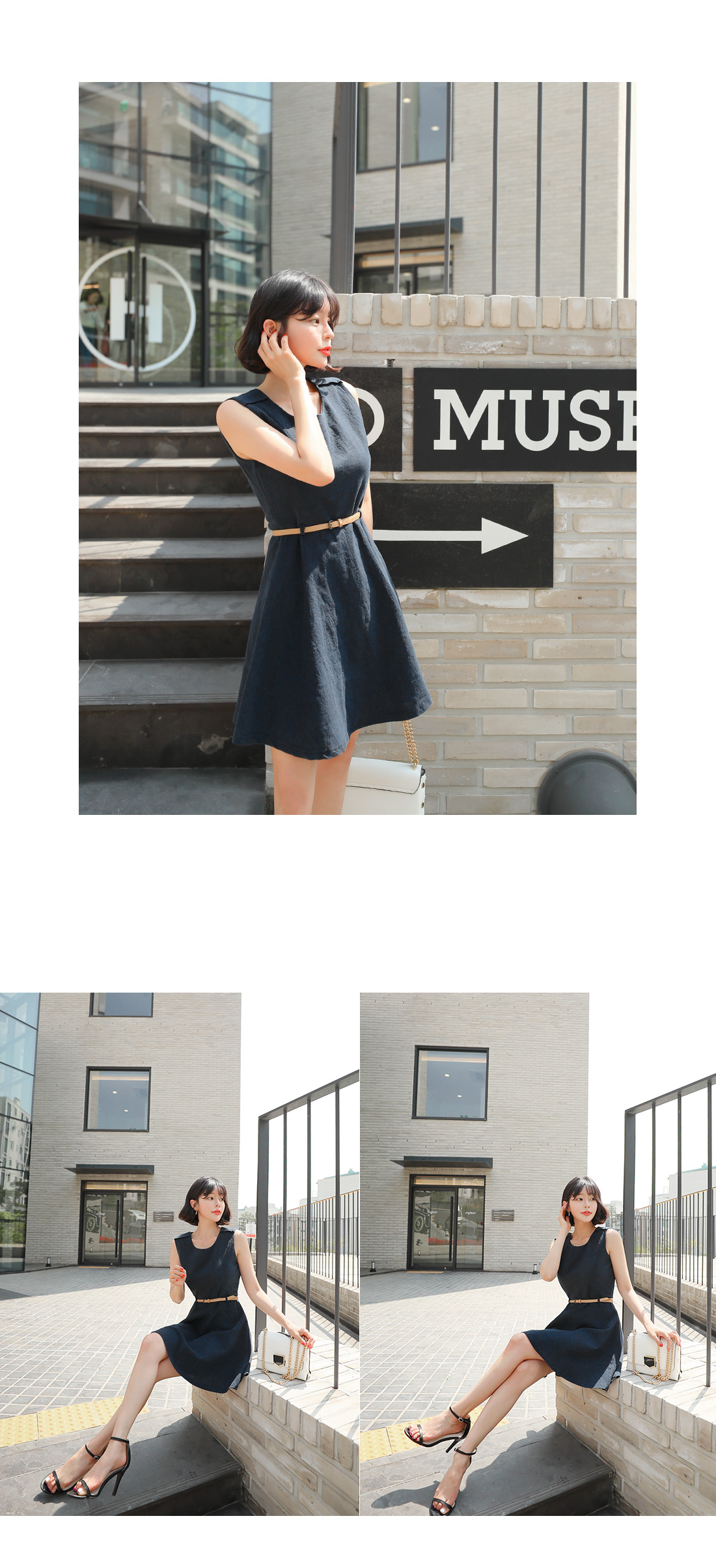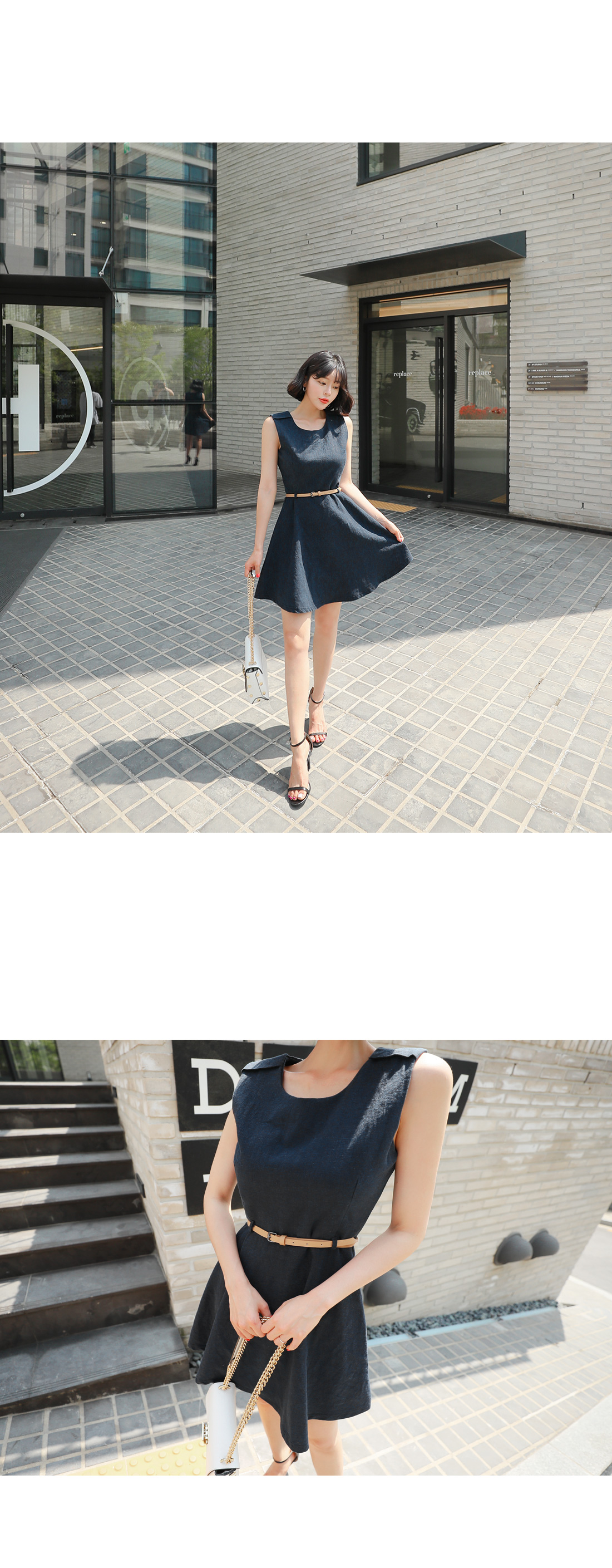 슬리브리스 디자인으로 단정하구요, 허리에 가죽벨트 set로 연결되어 페미닌하답니다! 따로 활용할수 있어 더욱 실용적이에요. 린넨 소재감으로 지금부터 S/S 시즌 쭉- 즐기기 좋은 원피스 아이템으로 추천해요!