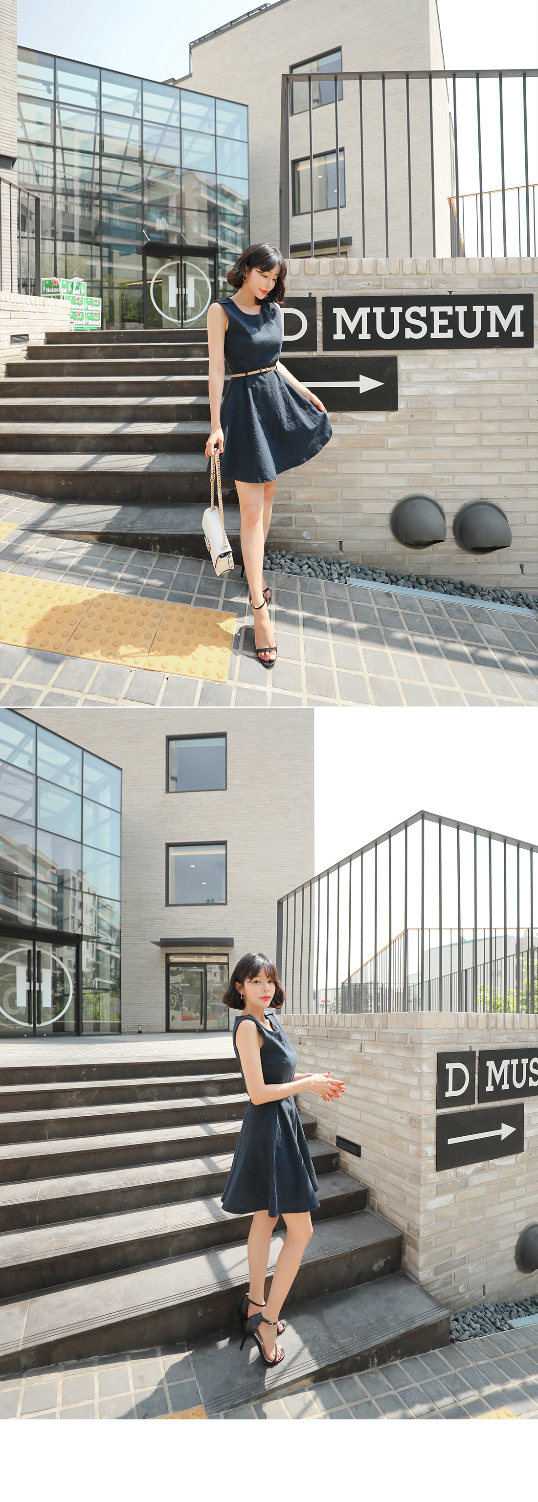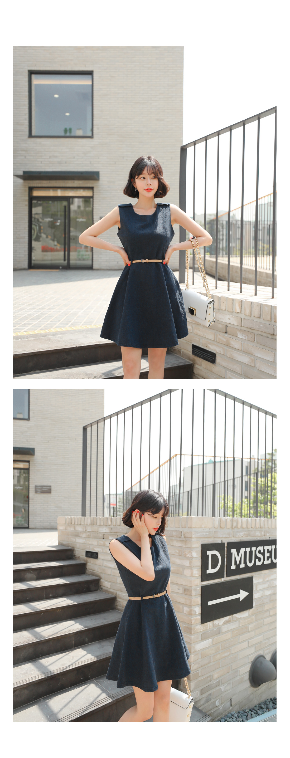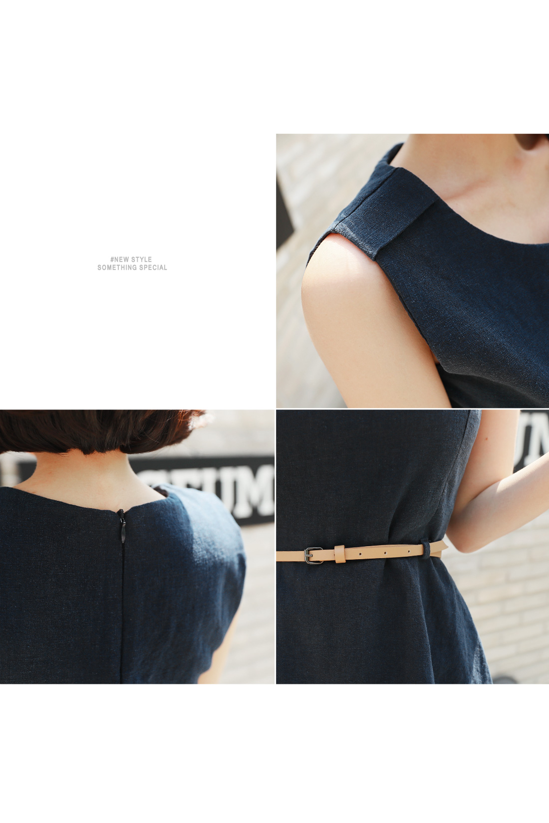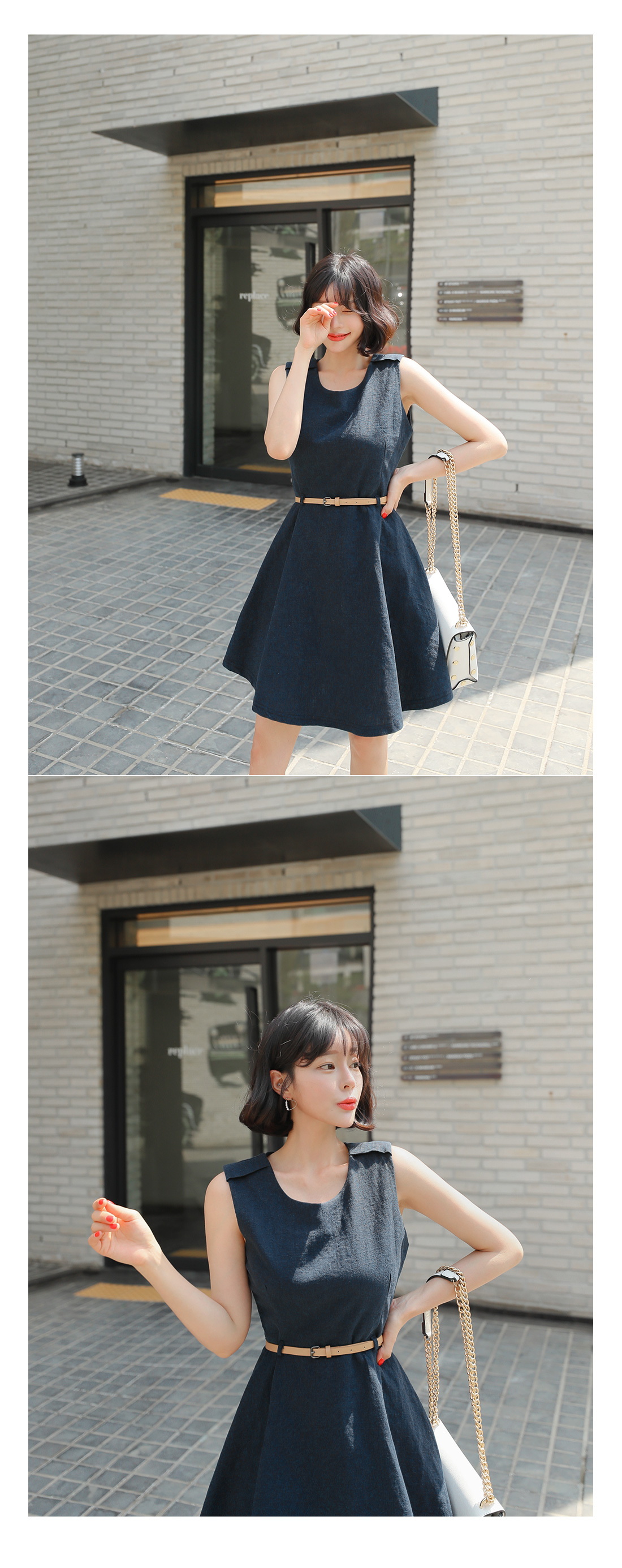 슬리브리스 디자인으로 단정하구요, 허리에 가죽벨트 set로 연결되어 페미닌하답니다! 따로 활용할수 있어 더욱 실용적이에요. 린넨 소재감으로 지금부터 S/S 시즌 쭉- 즐기기 좋은 원피스 아이템으로 추천해요!