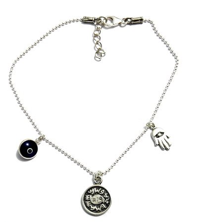 -. Binding : Jewelry -. Brand : MIZZE Made for Luck Jewelry -. Department : womens -. Feature : A beautiful 925 sterling silver anklet / Anklet Includes protection Solomon Seal, Hamsa charm and blue Evil Eye charm / The Solomon Seal Amulet is approximately 0.5" in diameter. / The anklet is a standard 9" and comes with a 1" extension. -. Label : MIZZE Made for Luck Jewelry -. Manufacturer : MIZZE Made for Luck Jewelry -. Model : GG702 -. ProductGroup : Jewelry -. ProductTypeName : FASHIONNECKLACEBRACELETANKLET -. Publisher : MIZZE Made for Luck Jewelry -. Studio : MIZZE Made for Luck Jewelry -. Title : Against Evil Eye Solomon Seal & Protection Charms Silver Anklet
