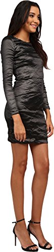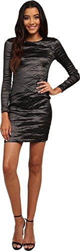 Figure-hugging mini dress crafted in a satin fabric with a metallic finish. Ruched detail adds style and texture. Jewel neckline. Long sleeves. Straight hemline hits mid thigh. Hidden hook and zipper closure at back. Lined. 55% polyester, 26% metal fiber, 17% modacrylic, 2% elastane;