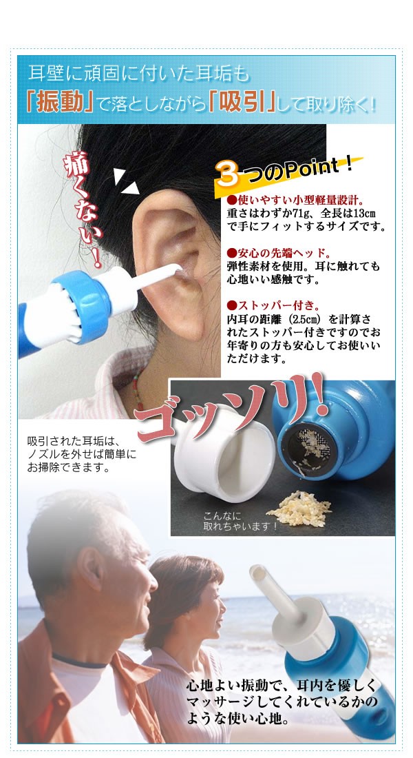 振動で耳垢を落として強力吸引!これだけで耳スッキリキレイ☆わずかな振動がまるでマッサージされているみたいに気持ちいいんです!耳掻きの苦手な方、お年寄りの方にもオススメです。