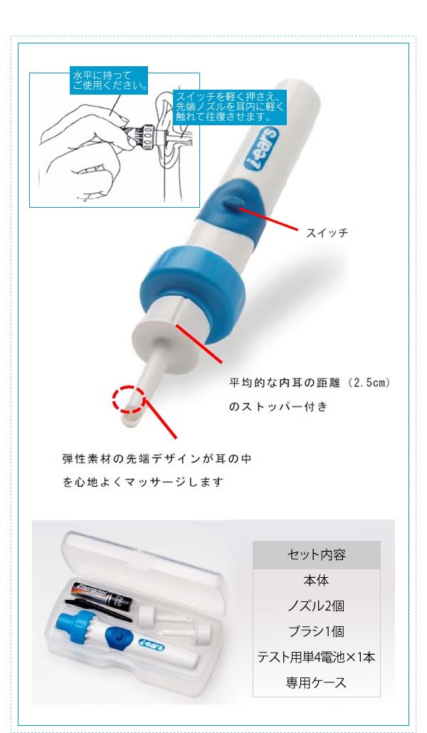 振動で耳垢を落として強力吸引!これだけで耳スッキリキレイ☆わずかな振動がまるでマッサージされているみたいに気持ちいいんです!耳掻きの苦手な方、お年寄りの方にもオススメです。 サイズ/全長13×径2.5cm 重量/71g 素材・材質/プラスチック セット内容/本体、ノズル×2個、ブラシ×1個、テスト用単4電池×1本、専用ケース 製造国/台湾※お届け地域により、別途運賃がかかる場合やお届けできない場合がございますので、お問い合わせ下さい。