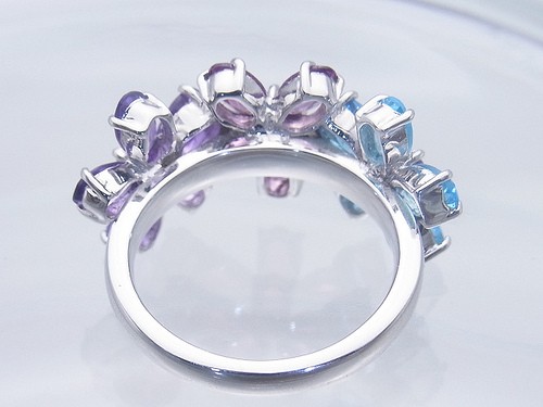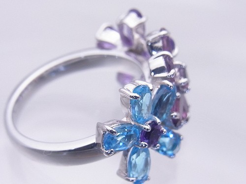 商品説明 ブルートパーズ・ガーネット・アメジストの3色花びらリングです。