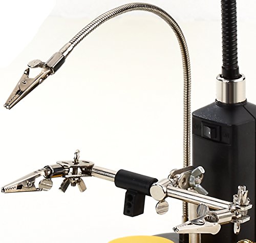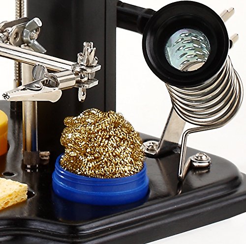 - Feature : See your work clearly and get those fine solder joints perfect / Integrated, LED illuminated 3X-90mm-Magnifying Glass makes for easier soldering / 3 helping hands with alligator clips for securely gripping your work / Solder Spool Brackets - Soldering Iron Holder - Cleaning Sponge & Brass Tip Cleaner - INCLUDED / Solder Flux included - solder and soldering iron NOT included