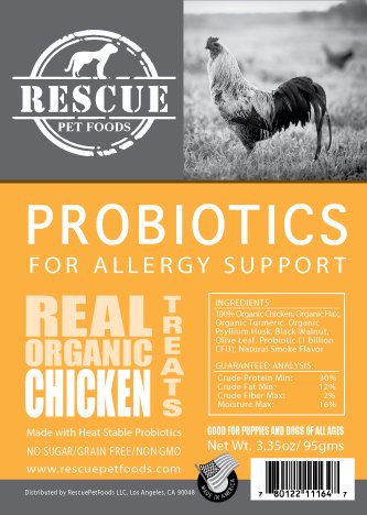 -. Title : Rescue Pet Foods - Organic Chicken Jerky Treats - Probiotics for Allergy Support - 3.35oz pkg