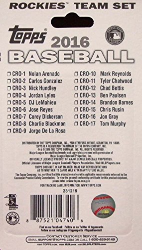 [Product Information]- This is a 2016 Topps Colorado Rockies Factory sealed special edition 17 card team set; cards are numbered COR-1 through COR-17 and are not available in packs. Players included are Nolan Arenado, Carlos Gonzalez, Nick Hundley, Jordan Lyles, DJ LeMahieu, Jose Reyes, Corey Dickerson, Charlie Blackmon, Jorge De La Rosa, Mark Reynolds, Tyler Chatwood, Chad Bettis, Ben Paulsen, Brandon Barnes, Chris Rusin, Jon Gray and Tom Murphy.