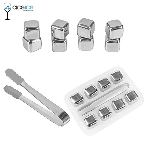 -. Feature : WHISKEY ROCKS. The item consists of 8 steel ice cubes or drinking stones or rocks, cooler and more fashionable than ice; keeps your drinks cool without diluting. Each cube is 2cm x 2cm x 2cm or 1" x 1" x 1" in dimension. The product also contains 5 1/2" steel tongs and a plastic chiller tray. / HIGH QUALITY. Shiny, strong, smooth and durable. FDA certified, food grade stainless steel non-toxic liquid-filled cubes are a non-diluting alternative to ice cubes, Dice Ice is manufactured by a premium wine and spirits accessories maker with an ISO 9001 quality manufacturing certificate. / ADVANTAGES OVER STONES: environmentally safe, reusable, and long lasting; won't scratch your drink wear! Do not give off a taste of stone and more durable and dishwasher safe! / EASY TO USE: Freeze the product for 3-4 hours or for best results, store in the freezer overnight; Great for whiskey, beer, scotch, bourbon, vodka, white wine and non-alcohilic drinks; NO DILUTION and retains the chill and flavor. Wash by hand or dishwasher then reuse again. / BONUS ITEM: Complimentary list of on the rocks of international mixed drinks to enjoy with your Dice Ice - see below!