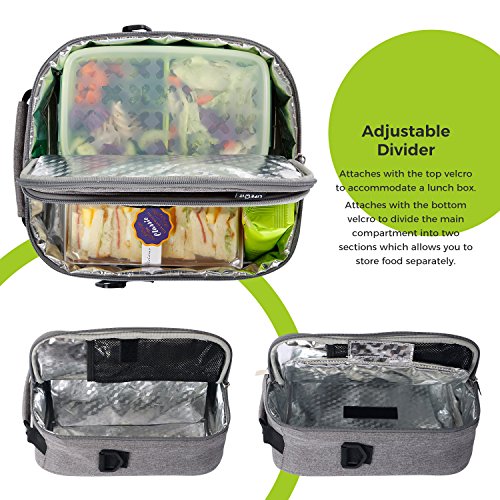 MAIN COMPARTMENT: Features an adjustable divider with velcro design to divide the main compartment into two sections which allow you to store food separately. Two zipper closures are designed for easy access to stored foods.