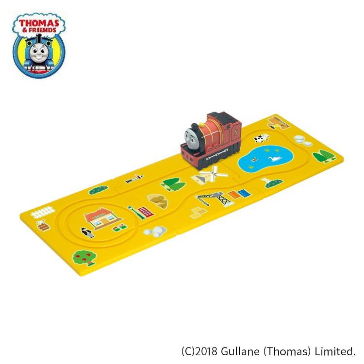 3枚のパネルでコースを作り、ジェームスを走らせるセット。付属のシールを貼って自分だけの情景が楽しめます。ジェームスがコミカルに動きます。 |