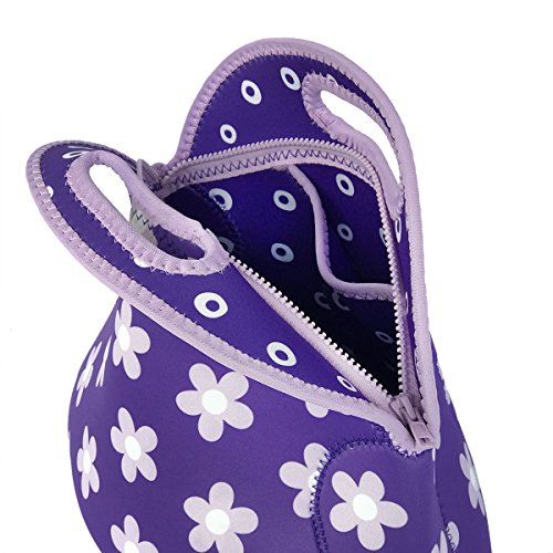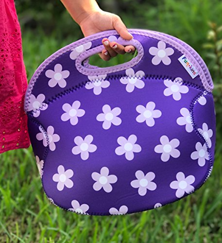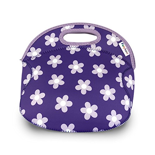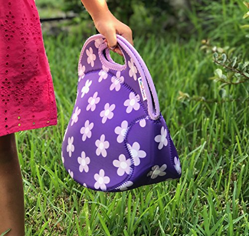 FUNKINS Washable, Insulating Neoprene Lunch Bag for kids, Extra Spacious for Reusable Containers, PURPLE FLOWERS