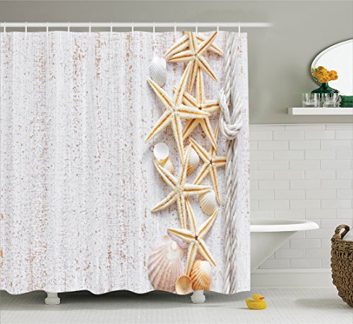 Seashells Shower Curtain by Ambesonne, Seashells and Starfish with Navy Rope in Vertical Direction Wood Surface Ocean Beach, Fabric Bathroom Decor Set with Hooks, 70 Inches, Ivory