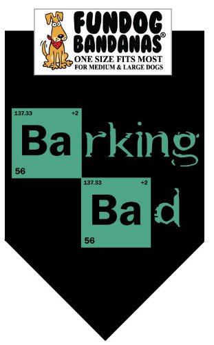 -. Binding : Misc. -. Brand : FunDog Bandanas -. Color : Black -. EAN : 0081159547981 -. Feature : Cute! / Fun! / Affordable! / Makes a great gift! / 22x22x31inches -. Label : The Dog Perk Corporation -. Manufacturer : The Dog Perk Corporation -. MPN : Fun-4565 -. PackageQuantity : 1 -. PartNumber : Fun-4565 -. ProductGroup : Pet Products -. ProductTypeName : PET_SUPPLIES -. Publisher : The Dog Perk Corporation -. Size : One size fits most for medium to large dogs -. Studio : The Dog Perk Corporation -. Title : BANDANA - Barking Bad for Medium to Large Dogs - black -. UPC : 081159547981