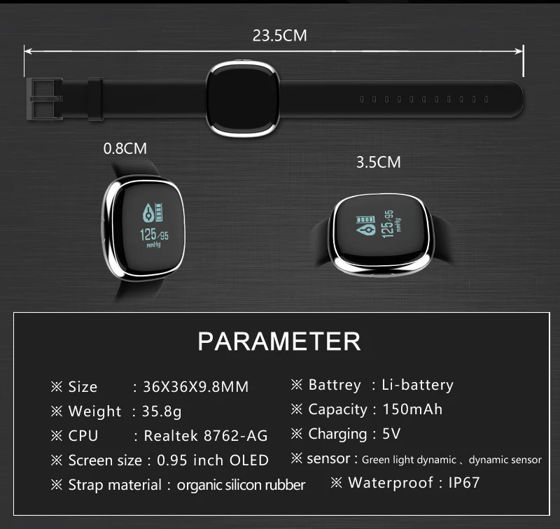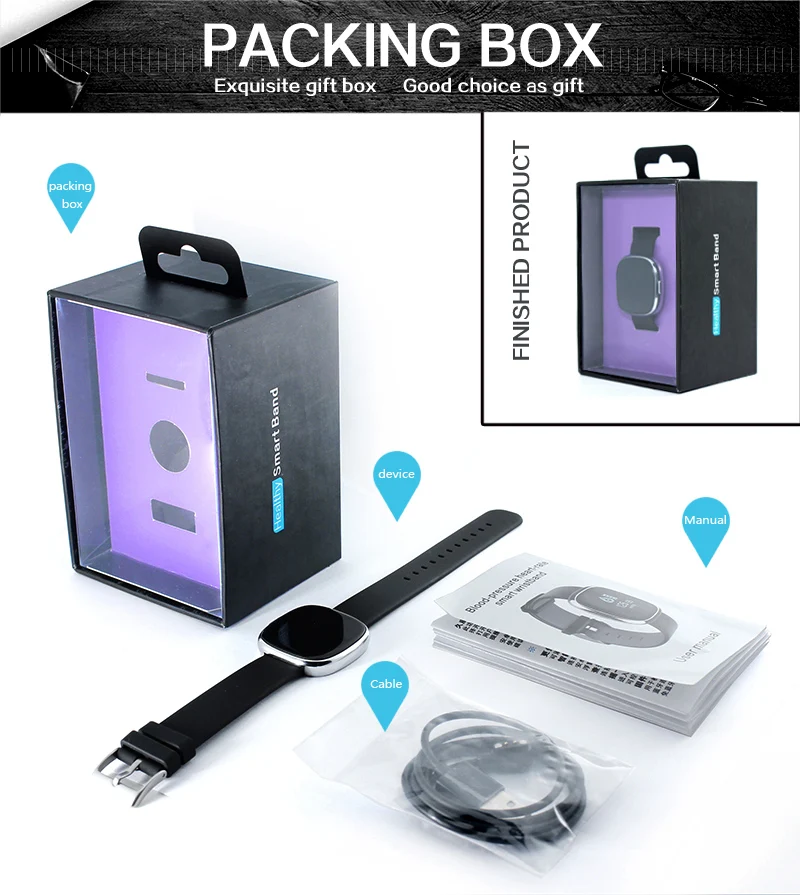 Function:Week,Alarm Clock,Push Message,Passometer,Message Reminder,Sleep Tracker,Activity Tracker,Heart Rate Tracker,Blood Pressure,Call Reminder,Fitness Tracker