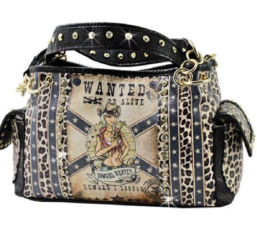 Product Description ~ ~Handbag with Lots of Class ?Cowgirl and Rhinestone Studs Accented the front of this Western Handbag and Wallet ?Top Zipper Closure ?2 Compartments and Zipper Pockets Inside ?Duel End Pocket ?Double Shoulder Straps ?Purse Measurements: 12L x 8.5H x 4W ***** Messenger Bag.....Cowgirl Rhinestones Accent the Front of this Over the Shoulder Purse - Adjustable Shoulder Strap - Zipper Top Closure - Zipper Pocket inside on back - Material Leatherette - Measurements 10L x 10H x 1W *****WALLET.... ?Cowgirl and Rhinestones Studs Accent the Front of this Wallet ?Id pocket with window ?Credit card slots ?Snap closure ?Rear zipper closure coin pocket ?Matching checkbook cover included ?Measurements 7.5 x 4.5 x 1 0