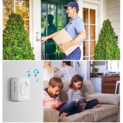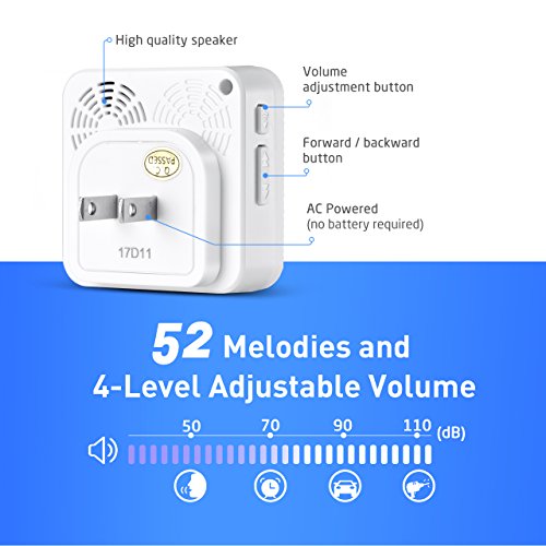 【52 Melodies with 4-Level of Adjustable Volume】: The wireless doorbell offers a wide selection of 52 chimes for your personal taste, including Christmas song (jingle bells) and more. 4-level of volume range from 25dB to 110dB.