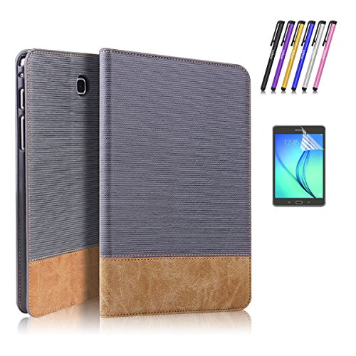 Premium PU Leather Folio Smart Cover Case Stand with Auto Sleep/Wake Feature, Card Pocket for Samsung Galaxy Tab A 9.7 SM-T550 P550 + Screen Protector Film and Stylus Pen (Gray)