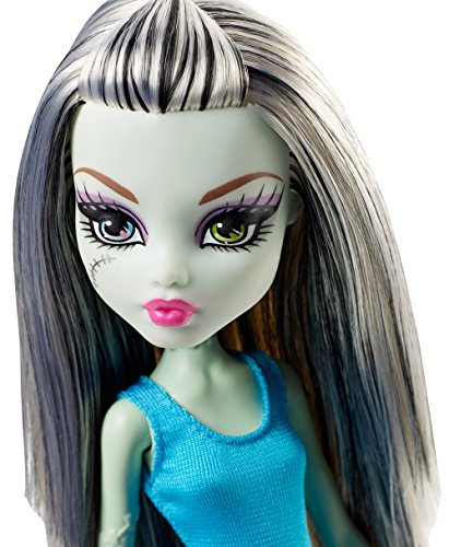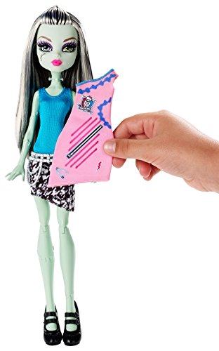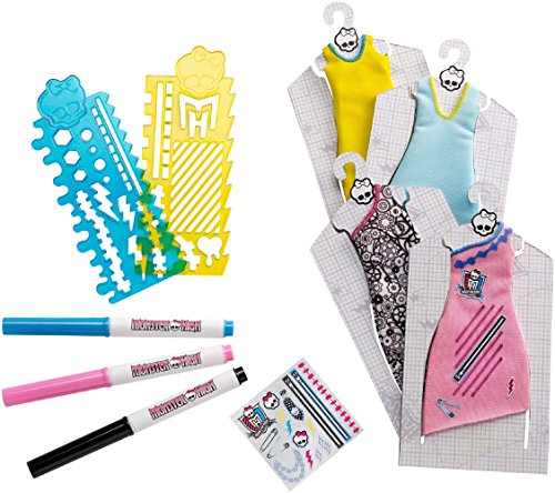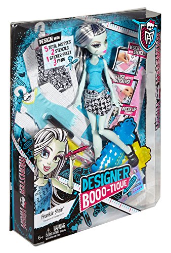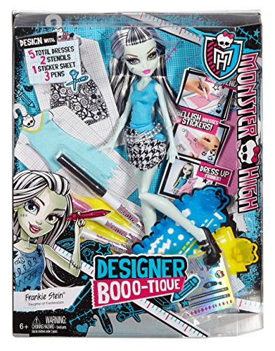 -. Feature : Create bootiful fashion designs for Frankie Stein doll with her Monster High Designer Booo-tique / Frankie Stein doll wears a dress that has a bright teal bodice and black and white P.R.Int skirt, plus she comes with four additional dresses, all of which you can decorate / Pick a fashion and secure it on the dress form, then choose a stencil and place it over the fashion / Grab a marker and color in as you like -- or work freehand for a totally unique design / There are two stencil forms with multiple shapes like lightning, metal bolts and the Monster High logo; three markers in pink, blue and black; and stickers that include stitches, zippers and safety pins / Young designers will love the opportunity to make voltageous fashions for the stylish daughter of Frankenstein -- and to express their own style too