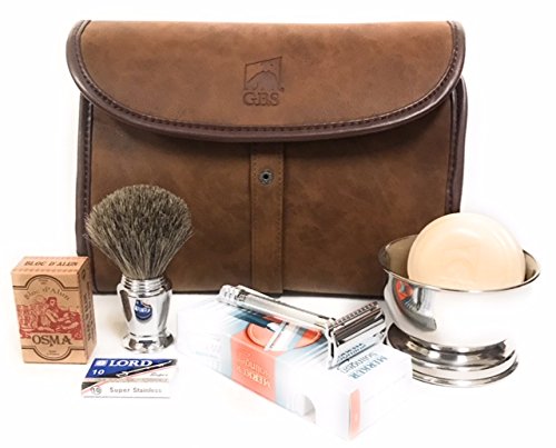 Merkur Deluxe Travel Dopp Kit - #23001 Razor, Chrome Shaving Brush, Bowl, Soap, Stand with Osma Block + Leather Toiletry Bag
