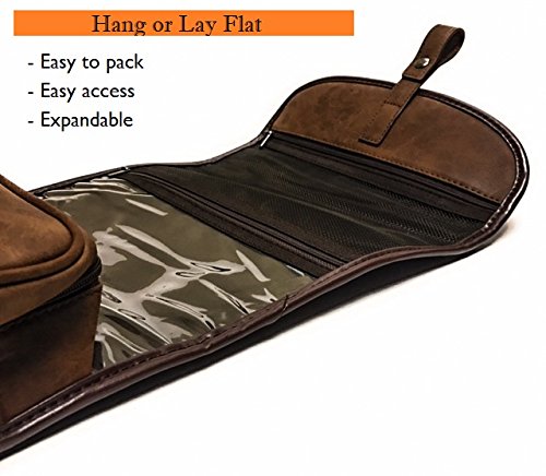 Leather Brown Dopp Bag - Toiletry bag has 1 large compartment with 2 large zippered storage areas. Water proof lining allows easy cleaning. Expandable pocket easily holds large accessories. Clear pocket for shampoos and possible leaky items. Closed Bag 10" x 3" x 6." Hangs 20"