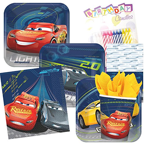 Disney Cars 3 Birthday Party Supplies Kit Serves 8 Plates Napkins Cups Tableware Supply Set Pack include Cars 3 Tablecloth with Birthday Candles