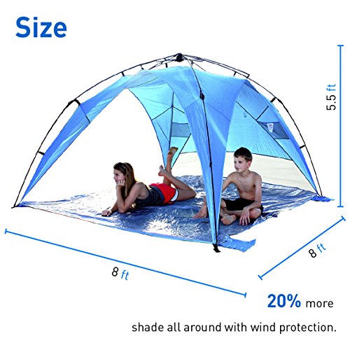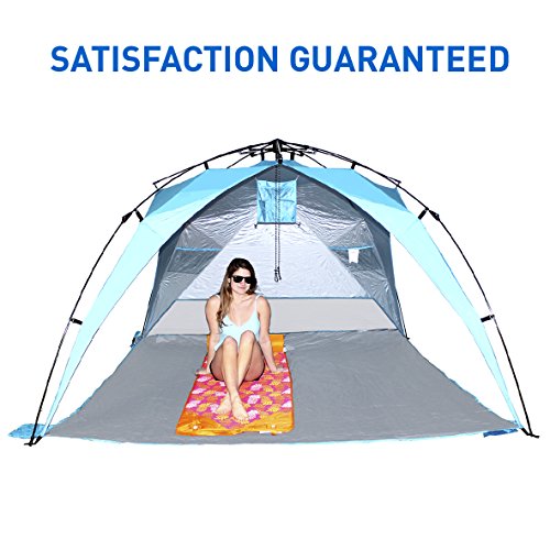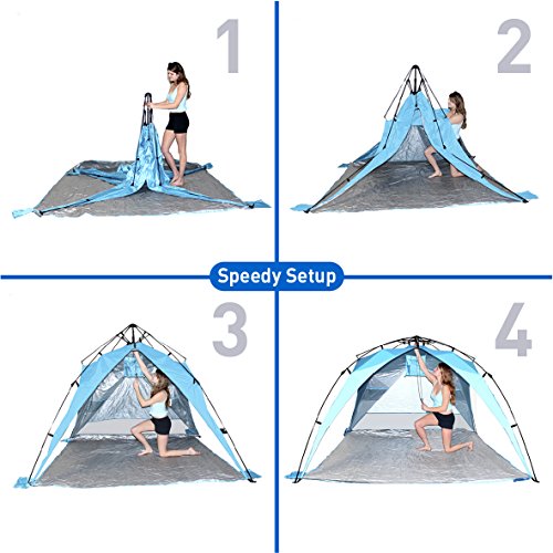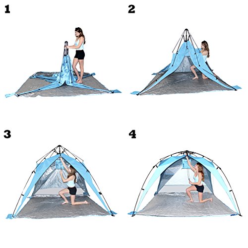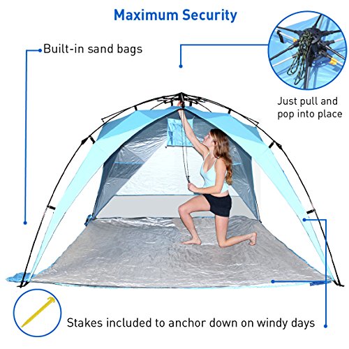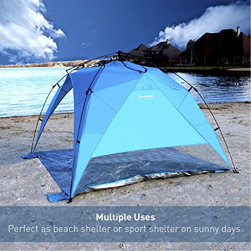INSTANT SET-UP - beach umbrella tent. No loose parts! Just pull the string and this pop up beach tent sun shelter opens quickly. Easy up canopy beach sun shelter can be used as a tent for beach or at the soccer field as a sport shelter for maximum shade and wind protection.