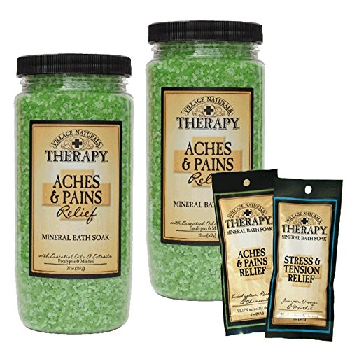 - Bundle package includes: TWO 20 ounce canisters of Village Naturals Therapy Aches & Pains Relief Mineral Bath Soak and 1 sample of EITHER Village Naturals Aches & Pains or Stress & Tension Mineral Bath.