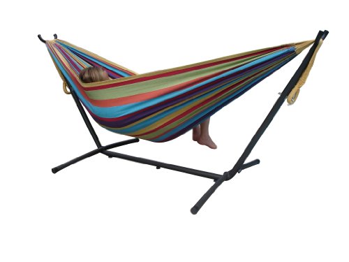 - Feature : Double hammock with space-saving stand / Hammock is 100-Percent cotton / Space-saving 9-Foot stand is constructed of heavy duty steel and assembles in minutes without any tools / Carrying case is included / Hammock bed is 63 x 94-Inch, with a total length of 130-Inch; accommodates two adults, 450-Pound capacity