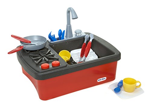 [Description] Portable toy sink and stove with real working faucet and drain Large sink area for water play and kitchen role-play Easy to clean plastic surface 13 fun accessories and clicking knobs Storage in base for all accessories