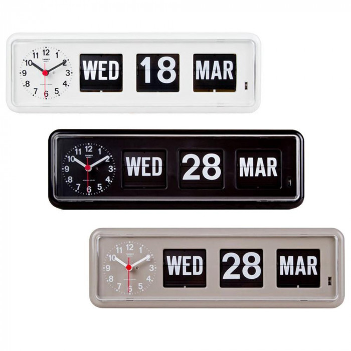 | パタパタめくれるカレンダー付きの時計です。壁掛け・置き時計として使用可能。パタパタと切り替わるカレンダーの隣にアナログ時計を配置したデザインで、日付も時刻も一度に確認でき便利です。レトロな雰囲気ただよう、シンプルで落ち着いたデザインはお部屋を選ばずどこにでもマッチします。 |