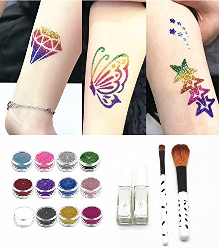 -. Title : Diamond Powder Temporary Tattoo Shimmer Glitter Tattoo Kit Waterproof Body Tattoo Art 12 Colors Paint with Stencil Brush