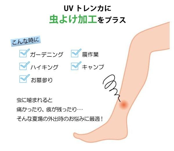 | 夏のお肌を守るお助けアイテム♪UVカット率約95%以上のトレンカに、虫よけ加工をプラスしました。普段使いはもちろん、スポーツやウォーキング時にも活躍!!通気性のある生地で夏でも快適にお使いいただけます♪ |