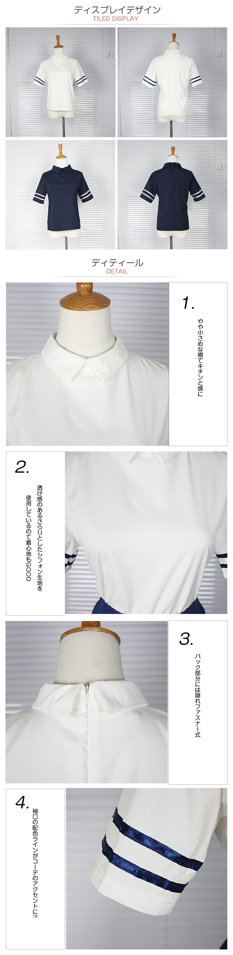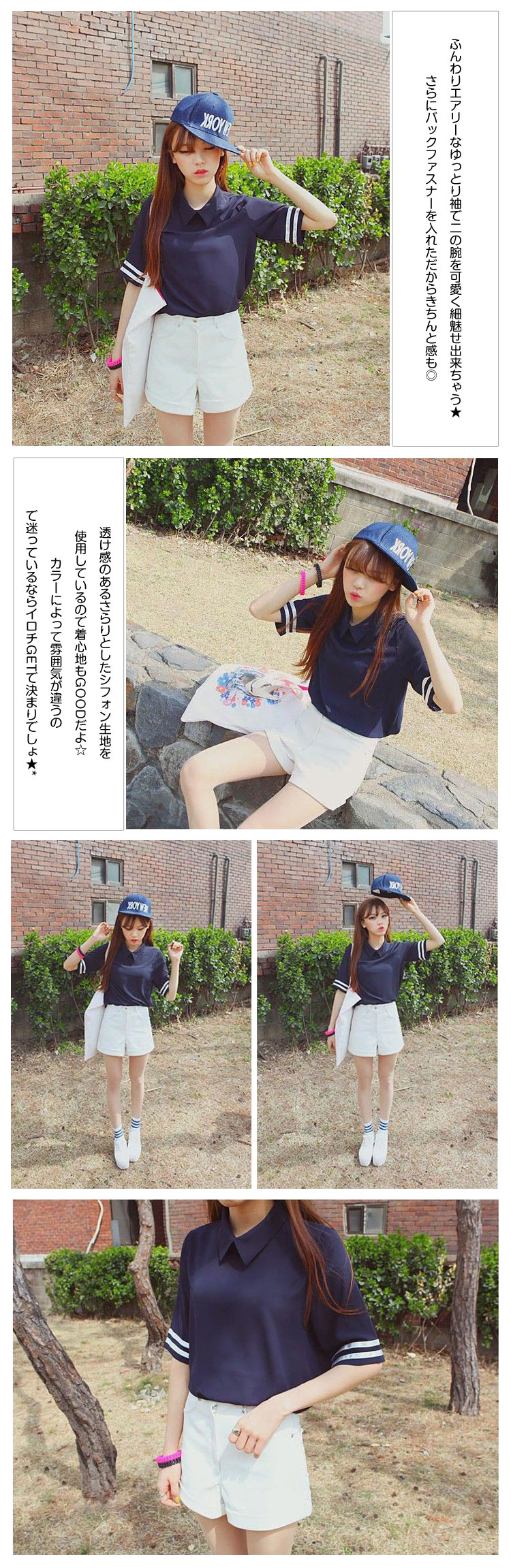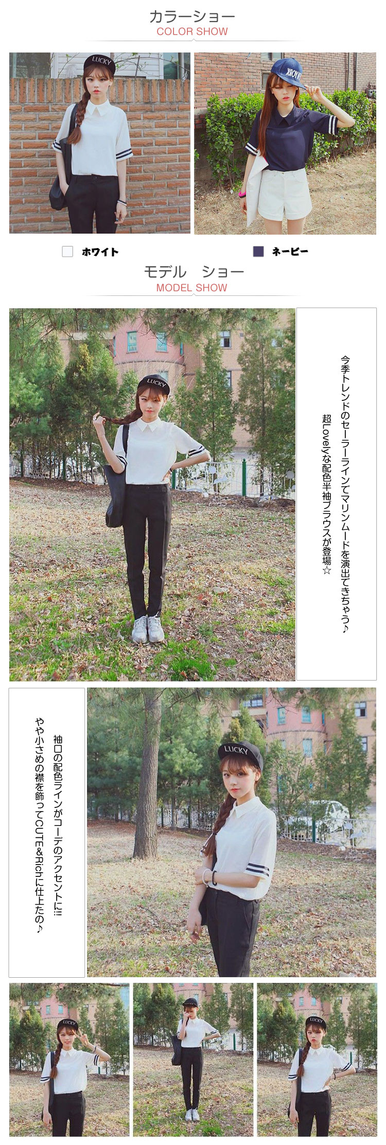 | 今季トレンドのセーラーラインでマリンムードを演出できちゃう?超Lovelyな配色半袖ブラウスが登場☆袖口の配色ラインがコーデのアクセントに!!やや小さめの襟を飾ってCUTE&Richに仕上たの?ふんわりエアリーなゆっとり袖で二の腕を可愛く細魅せ出来ちゃう★さらにバックファスナーを入れただからきちんと感も◎透け感のあるさらりとしたシフォン生地を使用しているので着心地もGOODだよ☆カラーによって雰囲気が違うので迷っているならイロチGETで決まりでしょ★* | |