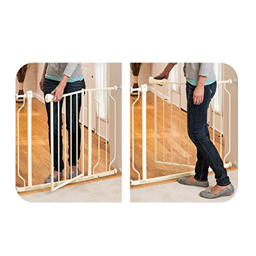 The Easy Walk-Thru gate helps parents keep children safe from household dangers. As a metal pressure gate, it is ideal for high-traffic areas because the swinging door allows for quick and easy pass through. Simply squeeze the handle and slide back to open the door. To close and lock the gate, just give the door a gentle push and watch the slam-latch feature take over. A quick glance at the red-green lock indicator will tell you if the gate is securely locked. The neutral styling blends well with any home decor and no tools are required for installation.