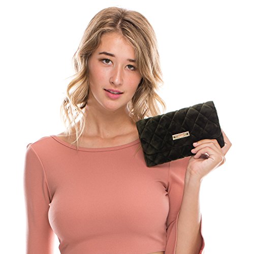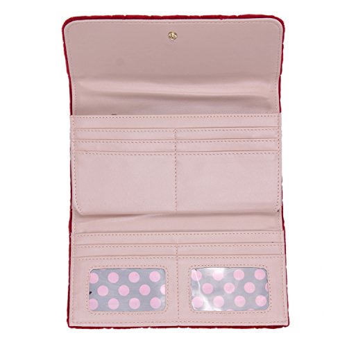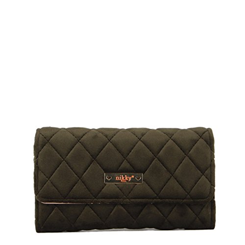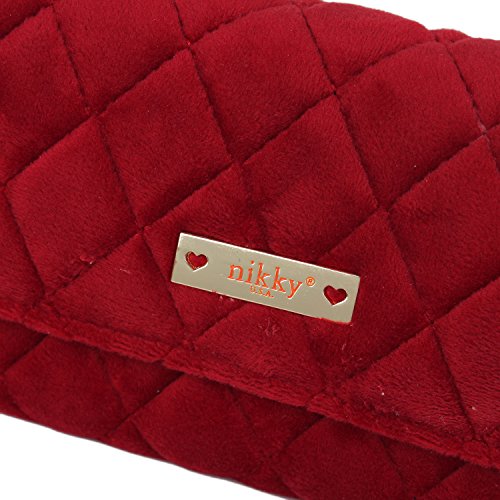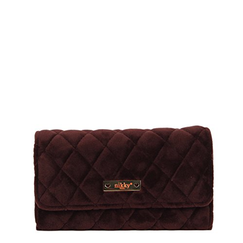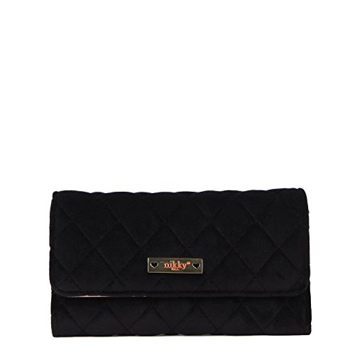 Binding : Apparel Product Description The Nikky Dasha velvet wallet is sure to be one of your key statement accessories for the season. Whether you mix it with casual pieces or go for a full-on glamorous look. Exterior Features: Made of high quality quilted velvet. Trifold with snap closure. Diamond shape stitch design. Signature Nikky logo nameplate. Interior Features: Two ID windows with multiple credit card slots. Multiple bill slots. Zip-up coin pocket. Eco-leather and nylon Nikky polka dot lining. RFID (Radio-frequency identification) BLOCKING WALLET. The fight against identity theft starts with your wallet. Nikky Wallets are manufactured with RFID-Blocking technology that prevents reader device signals from penetrating your wallet keeping your contents secure. For cleaning, wipe with damp cloth. 0