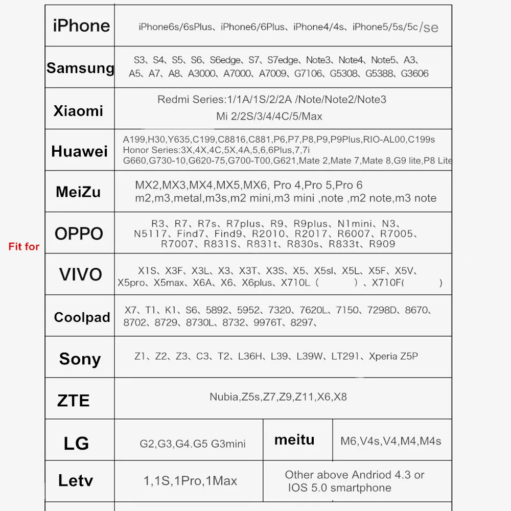 4.Compatible for iPhone 4 5 5s 5C 6 6Plus 6S 6SPlus se Samsung S5 S6 S6edge S6edge Plus S7/S7 edge Huawei Xiaomi smartphone