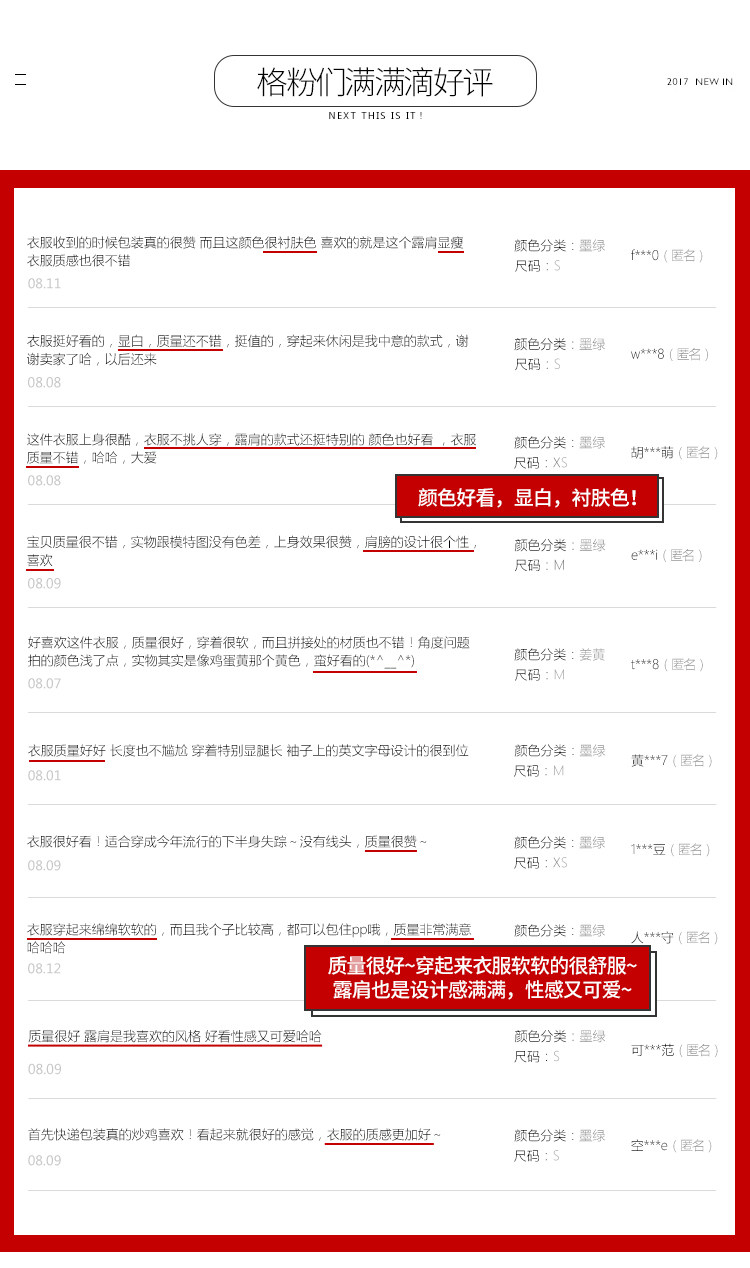 | Anne | 150 | 44 | 82/65/88 | S | 假两件的拼接设计很有设计,露肩的小细节,美美哒 |