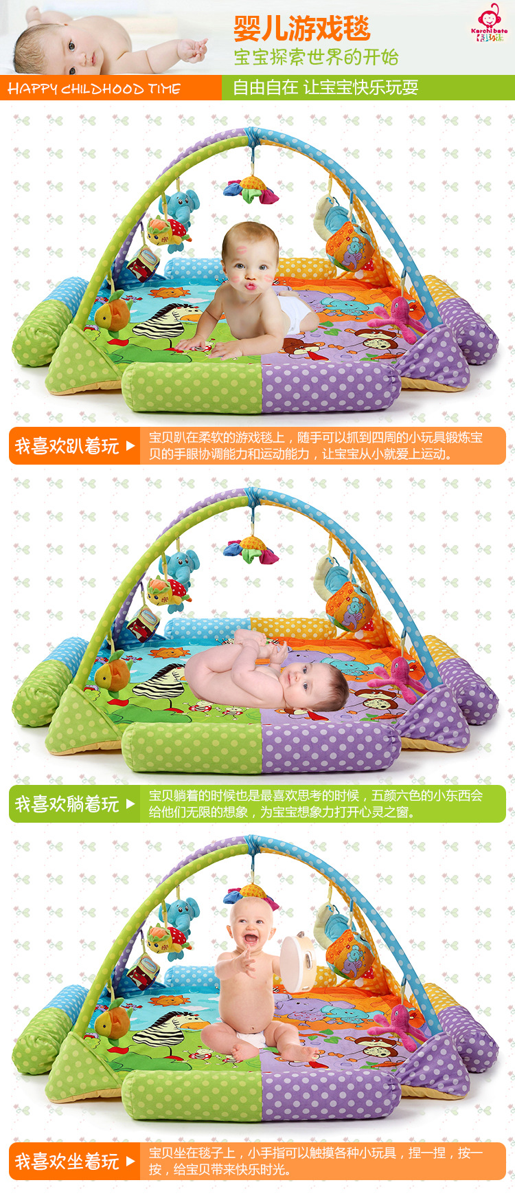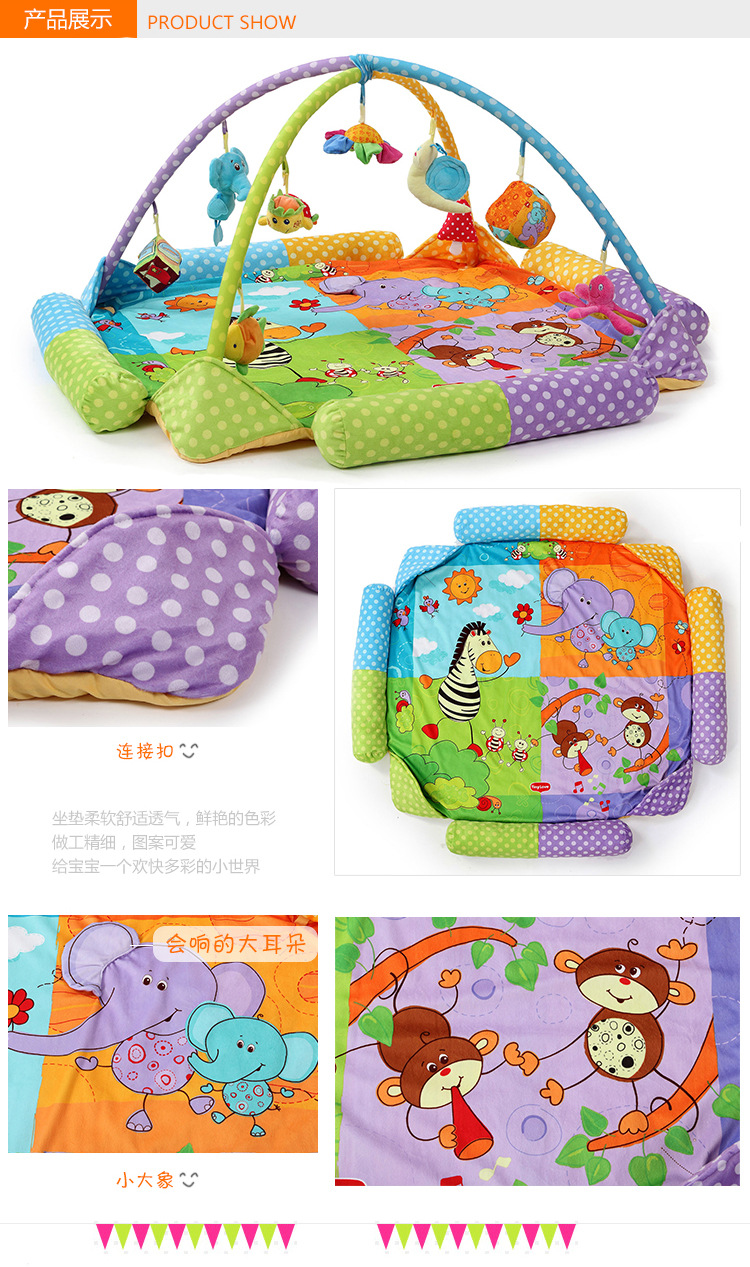 【主要功能】:宝宝玩,爬行,休息,亲子互动游戏等,支架上的小玩具都可以单独取下来作为玩具玩。 面 料:表面是超柔面料,底部是防潮面料。填充物是高级PP棉。