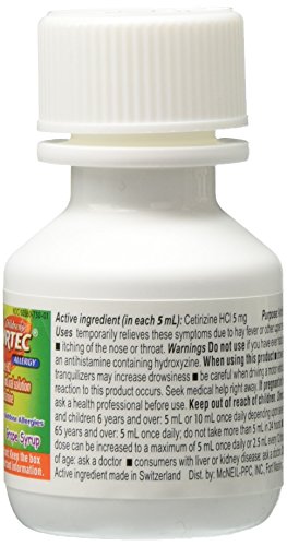 ReleaseDate : 2017-01-01 Studio : Johnson Johnson - Ketotifen Publisher : Johnson Johnson - Ketotifen Binding : Health and Beauty Product Description Children’s Zyrtec Allergy Syrup, Dye-free, Sugar-Free Grape relieves indoor and outdoor allergy symptoms in children. With 5 milligrams of cetirizine hydrochloride in each 5 mL, this over the counter allergy medicine offers 24 hour relief from common symptoms of hay fever and other upper respiratory allergies. Children’s Zyrtec is effective for treating symptoms of: runny nose, sneezing, itchy watery eyes, and itchy nose and throat. Children’s Zyrtec Allergy Syrup is for children ages two years and up, and is dye-free and sugar-free. 0