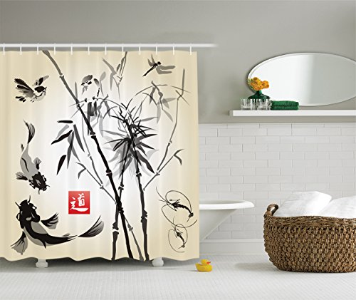 Ambesonne Traditional Japanese Decor Collection, Bamboo in The Bird and Fish Hand-drawn with Ink Image, Polyester Fabric Bathroom Shower Curtain Set with Hooks, Black Gray Ivory