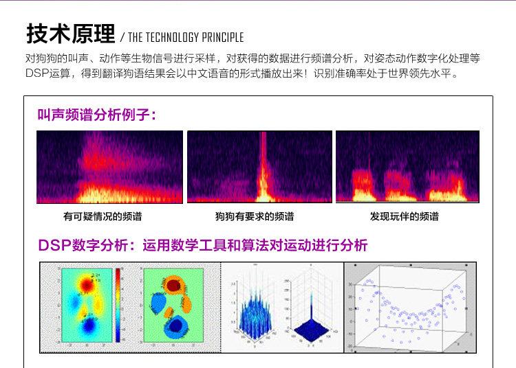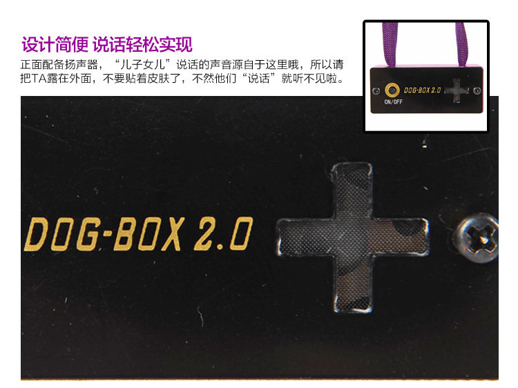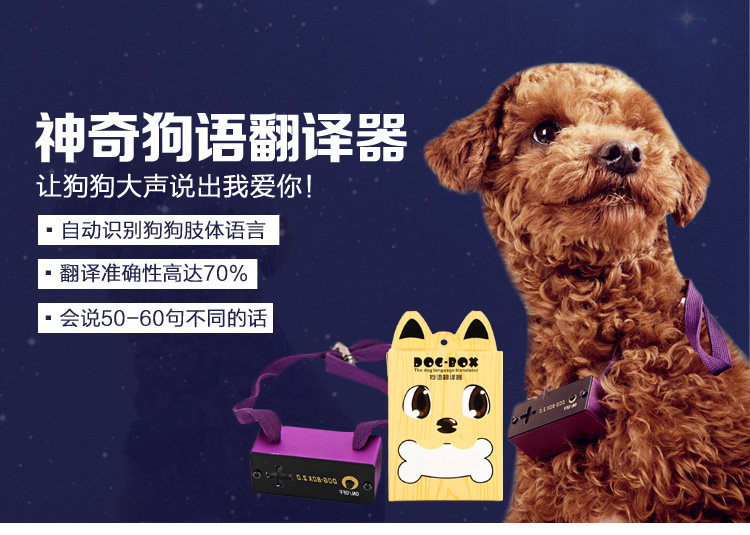 Dog language translator DOG-BOX2.0 by the 6th Pet Electronic Technology Co., independent research and development, and has a high-tech electronic products with independent intellectual property rights of petspet calls for identifying and body languagetranslated into human languageand voice in the form of play. Currently, the identification translation accuracy rate of 70%. This product is intended to add more fun dogspromote emotional communication between people and dogs, and to bring non-general zest for life.